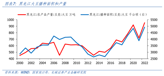 2022年黑龙江省明确提出“稳粮增豆”的总体思想。2022年2月,中央一号文件强调“大力实施大豆和油料产能提升工程”。黑龙江政府发布《2022年黑龙江省扩种大豆工作方案》和《2022年黑龙江省稳粮扩豆行动实施方案》,明确提出“稳粮扩豆”的总体思想,确定了扩种大豆1000万亩、产量增加26亿斤的目标。2022年12月,国家统计局公布数据显示,2022年黑龙江大豆播种面积7397.5万亩,占全国的48.1%,比上年增加1565.9万亩,增长26.9%,占全国增量的57.1%;大豆产量达到190.7亿斤,占全国的47%,同比增加46.9亿斤,增长32.6%,占全国增量的60.3%。黑龙江大豆播种面积、总产量均创历史最高纪录,均居全国第一。