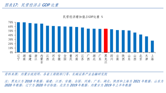 黑龙江民营经济发展不足,占比较低,代表性民企较少。截至2021年,民营经济贡献了黑龙江40%以上投资和税收,50%以上地区生产总值、80%左右出口额和90%以上的市场主体。相较于全国民营经济60%以上占比而言,黑龙江民营经济占比依然有提升空间。从民企质量而言,2023年全国工商联民营企业500强榜单中,黑龙江仅有1家民企上榜。2022年11月,黑龙江省委、省政府发布《关于振兴发展民营经济的若干意见》,从增强民营经济市场主体发展信心、拓展民营经济发展空间、打造公开透明政务环境、打造公平公正法治环境、打造高效便捷金融环境、构建亲清政商关系、促进民营经济人士健康成长7个角度出台了45条促进民营经济发展建议。