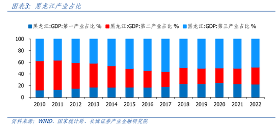 黑龙江产业结构失衡,第二产业占比相对较低。2022年,黑龙江三次产业结构为22.7:29.2:48.1,全国三次产业结构为7.3:39.9:52.8。在31省市中,黑龙江第一产业占比位居第一,但第二产业占比排名倒数第4,仅高于北京、海南和上海。相较于黑龙江2010年12.6:50.2:37.2的产业比重,结构失衡问题更加严重。在2020年,黑龙江第二产业占比25.4%,创1952年有统计以来最低。
