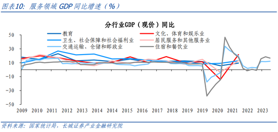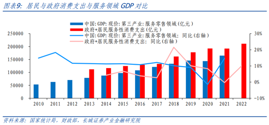 我们参考GDP生产法下的涉及服务零售领域的细项。包括第三产业中的住宿和餐饮业、教育、卫生社会保障和社会福利业、文化体育和娱乐业、交通运输仓储及邮政业、居民服务和其他服务业共计六项。GDP同比自2010-2019年一直在10%以上的高位, 之后受疫情冲击,2019-2021复合年均增速降低至6.3%(2020年同比-1.4%,2021年同比14.7%)。与之类似的,居民服务型消费支出+政府服务性支出在2013-2019年也保持了8%以上的复合年均增速,尤其是2018年同比达到20%以上的高位;2019-2022年增速下滑至5.9%。