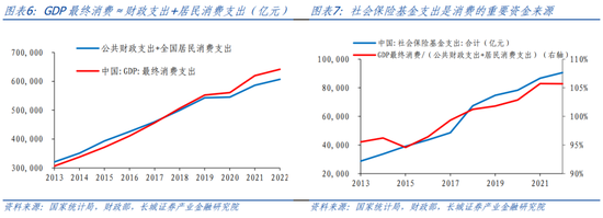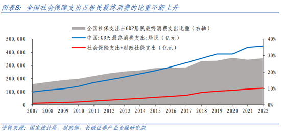 那么同样的,我们认为服务零售额中有居民消费的部分,也有政府消费的部分。统计局数据显示,今年前三季度,服务零售额同比增长18.9%,而同期居民人均服务性消费支出同比增长14.2%,这一定程度表明政府服务性消费支出也有较大贡献。从全国公共财政支出与居民消费支出的总和来比较GDP最终消费支出可以看出,两者在过去十年的走势中非常的接近。虽然最终消费支出与前两者之和的比值在不断的上升,反映了公共财政支出中的投资项以及财政“四本账”中的社保基金支出等造成的差异在扩大,但基本上能涵盖所有的消费支出。社会保障支出是消费的重要组成部分,也是老、弱、病、残等社会弱势群体的收入和消费的主要资金来源。2010年全国社会保障支出(社会保险支出与财政社保支出之和)占居民最终消费支出的比重为15.9%,2020年提高到28.7%。