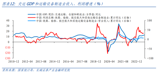 对于交运行业,可以对照铁路、船舶、航空航天和其他运输设备制造业的营业收入及利润总额增速。运输设备制造业利润增速自1999年2月起每月公布,营业收入增速自2017年2月起每月公布,总体看,近几年与交运行业GDP增速整体较为接近,不过利润增速波动相对较大,营业收入增速相对稳定。今年前9月,铁路、船舶、航空航天和其他运输设备制造业营业收入和利润总额累计同比分别为7%和32.5%,尤其是利润增速明显高于交运行业GDP累计同比的12%,可以侧面验证交运行业服务零售具有较高增长。