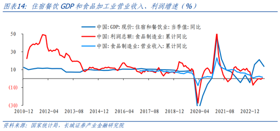对于住宿餐饮行业,可对照食品制造业的营业收入和利润总额增速。2017-2019年,食品制造业营业收入增速与住宿餐饮业GDP同比基本一致,2021年以来出现一定背离。同样的,2014年以来,食品制造业利润增速与住宿餐饮行业GDP同比多数时间较为一致,不过2022年后出现一定背离。今年前8月,食品制造业营业收入和利润总额累计同比分别增长1.7%和0.4%,明显低于前三季度住宿餐饮业GDP累计同比的13.7%,仍在背离。我们理解住宿餐饮业GDP高速增长有较大的低基数因素;而食品制造业处于产业上游,去年营业收入、利润增速较高,今年在PPI持续负增影响下,营收、利润增速相对较低,这可能是数据背离的一个原因。