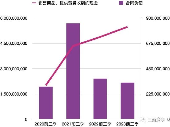 就前三季度表现来看,舍得酒业合同负债已经连续两年同比减少,但作为经营现金流中的主要收入指标销售商品、提供劳务收到的现金却持续稳定增长。