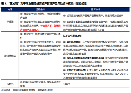 简单来说就是,如果能详细掌握资管产品底层资产,按照“穿透法”计提。如果不能,根据基金募集说明书等对底层资产范围的限定,进行“授权基础法”计算。如果“授权基础法”也不适用,则按照1250%计提权重。