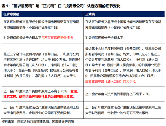 值得关注的是,本次“正式稿”对“投资级公司”的认定趋严,我们认为主要变化在资产负债率要求方面。“征求意见稿”要求“上一会计年度末资产负债率原则上不高于70%,金融、建筑工程、航空运输等特殊行业的公司可适当放宽”。“正式稿”则删除了后半句话,即删除了对于“金融、建筑工程、航空运输等特殊行业”资产负债率的放松监管(表1)。
