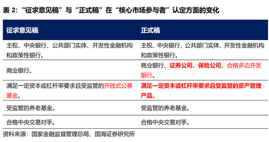 “征求意见稿”和“正式稿”提出了“核心市场参与者”的认定,主要涉及资金质押回购交易。