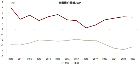以上的分析显示,近期的宏观经济变量的走势符合经典的宏观经济模型隐含的调整机制和路径,但一个关键问题是供需平衡的均衡点本身有没有随时间而变化?如果均衡点(比如潜在增长率)不变,则作为调整传导机制一部分的汇率贬值仅是暂时的波动,未来会回归过去的均衡水平。但如果均衡点本身在变化,甚至供需调整重新均衡的过程会导致均衡水平发生变化,则我们需要关注短期平衡和长期平衡的动态效率,或者说短期稳增长的不同方式对长期增长的影响。过去3年,美国贸易逆差增加,中国的贸易顺差增加(图表3),一个流行的解读是视其为“脱钩”或者“去风险”的反证[9],有观点甚至认为逆全球化并没有发生。但是,我们认为这一现象还有另一种解读,这是中长期产业链调整在短期的体现或路径载体:内需强的国家通过贸易逆差获得低成本的实体资源,支持国内的经济结构和产业链调整,内需弱的国家则向其他国家进行了实体资源净转移。