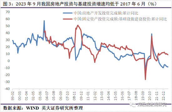 为什么中央金融工作会议确定的“稳健”的货币政策“偏松”,而全国金融工作会议确定的“稳健”的货币政策“偏紧”。我们认为,与会议召开时的宏观经济形势有很大关系,具体而言,2017年全国金融工作会议召开时,宏观经济处于上升期,而2023年中央金融工作会议召开时,宏观经济处于筑底期。我们具体分析如下。从经济指标看,2017年6月我国出口金额累计同比与进口金额累计同比分别为7.75%、18.84%,而2023年9月分别为-5.70%、-7.50%;2017年6月房地产开发投资完成额累计同比与基础设施建设投资完成额累计同比分别为8.50%、16.85%,而2023年9月分别为-9.10%、-8.64%。从价格端看,2017年6月我国CPI当月同比与PPI当月同比分别为1.50%、5.50%,而2023年9月分别为0%、-2.50%。