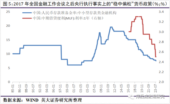 通过以上分析,我们认为开会时的宏观经济形势大概率直接影响金融工作会议对货币政策主基调的确定。但是,我们同样认为,中央(全国)金融工作会议召开时所确定的货币政策主主基调,大概率在未来4-5年会发生转向,毕竟,4-5年的时间里,足以走完一个完整的库存周期。具体看,2017年全国金融工作会议之后,央行并没有执行“稳中偏紧”货币政策,而是执行事实上的“稳中偏松”货币政策,体现为2017年7月之后,央行连续13次单边下调大型存款类金融机构存款准备金率6.50个百分点,连续15次单边下调中小型存款类金融机构存款准备金率7.50个百分点,与此同时,在短暂地两次累计上调1年期MLF利率0.10个百分点后,连续7次单边下调1年期MLF利率0.80个百分点。究其原因,2018年与2019年发生了中美贸易摩擦,冲击我国宏观经济,紧接着,2020年至2022年发生新冠肺炎疫情,再次扰动我国宏观经济,最后,在需求低迷背景下,2023年我国CPI当月同比两次滑进“负值”区间。