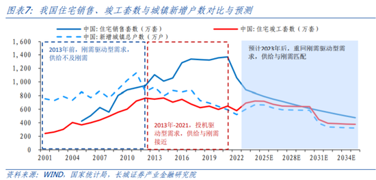 从人口周期看:未来随着城镇化进城的持续放缓,地产市场可能会重新回到刚需驱动,供给与刚性需求逐步匹配。我们测算,若在2030年之前实现住宅销售套数与住宅竣工套数的基本匹配,对应住宅销售套数大致可能需按照每年-5%的增速发展。