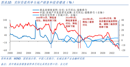 而当房地产需求步入下行周期,需求逐渐低于供给,房价产生下降压力,此时政策倾向于通过降低贷款利率等手段拉动需求曲线向上平移,使短期需求与供给之间的缺口维持正值,同时也维持房价上涨。我国在2008年、2014-2015年均推出过较强的降利率措施以刺激地产需求,有效降低实际房贷利率,商品房销售增速也在政策落地半年内见底回升,也足见房贷利率作为重要的调节工具,对当时的地产销售回升有较强作用。