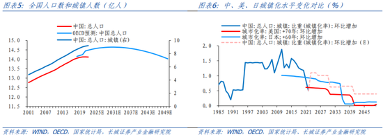 根据日美两国过去城镇化发展的历史经验,我们预计未来较长周期内城镇化率速度仍将继续逐步放慢。美国1952年后城镇化率超过65%,之后城镇化速度开始逐步放缓,城镇化率每年增加不超过0.6个百分点;日本在1962年开始城镇化率达到65%以上,之后城镇化率每年增长不超过0.9个百分点,1975年以后进一步放缓,城镇化率每年增长甚至低于0.1个百分点。当前我国城镇化率刚刚超过65%,分别落后美国和日本大约70年和60年,对照来看,我国高歌猛进的快速城镇化推进可能基本结束。实际上我们在2023年6月发布《 中国人口趋势研判及建议》报告已对未来数十年全国人口及城镇化率做出预测,本文沿用当时预测,也可以看到,未来数十年可能进入城镇化速度的持续放缓期。