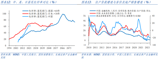 我们知道过去20余年地产需求快速上升伴随着居民贷款的提升,其另一面是居民债务的快速攀升。与美日对比,我国居民部门杠杆率增长较快,从2006年的11.5%到2020年底的阶段性高点61.9%,只用了14年;而日本和美国分别用了35年和50年的时间,才完成债务率50个百分点的增长。随着居民杠杆率不断提升,居民消费能力和信贷能力会受到挤压。居民债务攀升到一定水平,换言之,居民消费与信贷能力减弱到一定水平,经济内生动能也会减弱,从而引发居民的“去杠杆”,债务周期将进入下行阶段。而在债务下行阶段,资产需求回升对降低利率的敏感度可能降低。这也可以解释为何2020年以来短周期模型中实际房贷利率的回归系数会扩大超过十倍之多。