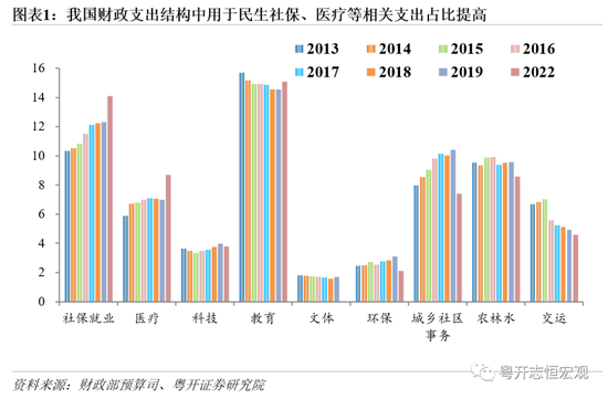 第四,财政支出要标准化,提高财政支出绩效,进一步优化财政支出结构、提高支出效率,把有限的财政资金用在刀刃上。政府收支尤其是支出体现国家战略和政策方向,要加强对预算编制的宏观指导,确保国家重大战略落地。优化支出结构,从发展财政转向民生财政,更多体现“取之于民用之于民”,转向教育、医疗、养老以及新型基建,增加对“人”的投资与消费,促进人口数量走向素质红利。近年来我国用于社保就业、医疗的财政支出占比有所增加,用于交运、农林水等基建类支出占比有所下降,支出结构在优化,2022年社保就业、教育、医疗三者分别占财政支出比重为14.1%、15.1%和8.7%,合计占比37.9%,较2013年提高6个百分点,但仍远低于美国、德国等发达经济体。