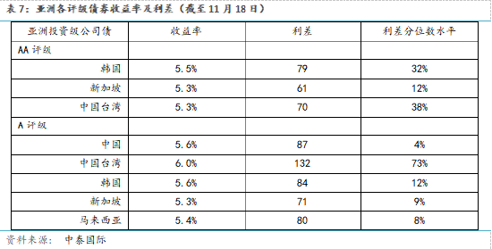 亚洲美元债分评级来看,据GS统计,高评级债券表现尤为明显,韩国、中国台湾和新加坡AA评级债券的利差水平处于金融危机以来32%、38%和12%分位数水平;亚洲A评级债券中,中资、韩国、马来西亚和新加坡的信用利差水平分别为4%、12.2%、8%和9%,接近历史最低水平,见图表7。整体而言,亚洲各主要经济体投资级债券利差处于中位数以下水平。