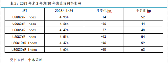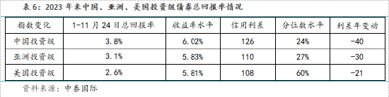 在全球利率大幅上行的背景下,截至11月24日,中国、亚洲、美国投资级债券今年以来总回报率分别为3.8%、3.1%、2.6%,2022年则分别为-10.1%、-11.2%、-15.8%,见表3。从2022年的负回报率到今年表现转正,主要是受利差收窄影响,尽管今年以来2年期至10年期等各期限美债利率上行了45-60bp左右。但分区域来看,中国、亚洲和美国投资级债券指数分别收窄了40bps、30bps和20bps,收窄幅度为2020年以来最大,见表4-5。截至今年11月,中国、亚洲、美国投资级债券指数利差分别处于处于过去5年的24%、27%及60%分位数水平,见表6。基于利差相对价值策略,全球范围来看,目前投资美国、日本、韩国的投资级债券更具性价比。