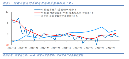 接着,中国作为世界排名第二大经济体,持续存在着贸易盈余和财政赤字。这在理论上很少出现,对于封闭经济内部平衡的经济体来说,Y=C+I(产出被消费和投资完全占用);只有内需不足的时候,才需要政府支出,也即Y=C+I+G。对于开放经济体来所,其内外部平衡的最佳状态是G=0(政府赤字率为0),NX=0(国际收支平衡),这与封闭经济体的内部平衡一致。如果是出口依赖型国家,允许出现Y=C+I+NX,国内消化不完的部分出口给国外消费者,这种不平衡并不会带来严重的经济失衡问题,可以通过汇率的持续升值重新平衡。对于美国来说,它出现的是双赤字问题,也即Y=C+I+G+NX。NX是负的,G是正的,也就是政府支出扩大导致进口增加,贸易赤字扩大。但是对于中国,我们出现的是G是正的,NX也是正的。也即是外部需求不足以消化完我国剩余生产能力,需要依靠政府消费来填补一部分内需不足的问题。从图1可以看出,储蓄与投资的差额与贸易顺差基本相同,说明贸易市场我们并未出现失衡,但国际收支持续盈余说明贸易顺差并未被资本和金融逆差相对冲。
