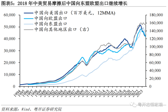 当然,中国向东盟出口的增加也受到产业链转移和外溢的推动。贸易摩擦之后,一部分中国对美国的出口从双边贸易转向三角贸易,即中国向东盟出口中间品,再由东盟加工组装后出口到美国。若将直接和间接对美国的出口纳入考量,则美国对中国出口的依赖度反而有所提升。这也意味着,区域间的脱钩断链并不容易,全球化与区域化并不总是矛盾。区域化或许是慢速全球化的一种形式,从长期看同样可以促进全球化的进一步提升。