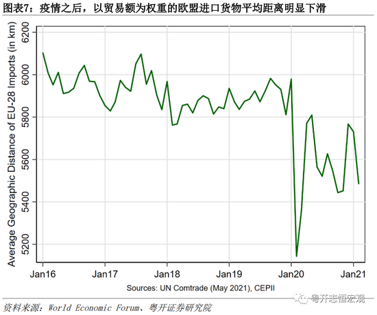 疫情爆发催化全球贸易安全模式,加速全球价值链转向区域化本土化。疫情期间,以中国为代表的亚太地区防控效果较好,在三大生产网络中率先复苏,一方面使得区域价值链的内部联系进一步加强,另一方面也使其他地区对亚太网络出口产品的依赖度加深。随之而来的是更多国家和地区开始意识到产业链安全可控的重要性并开始采取相应措施加强产业链韧性,例如美国拜登政府极力推动制造业回流、友岸生产或近岸生产,欧洲也提出“开放性战略自主”(open strategic autonomy)以加强关键产品的供应链韧性。安全模式下的全球价值链加速向区域化本土化转型。一个观察区域化的方式是考察进口商品来源国与进口国的平均距离。欧盟进口商品的加权平均距离从中美贸易摩擦前的6000公里降低至贸易摩擦后的5900公里。而疫情之后,欧盟进口商品的距离进一步下滑至5600公里,价值链的区域化本土化或正在加速。