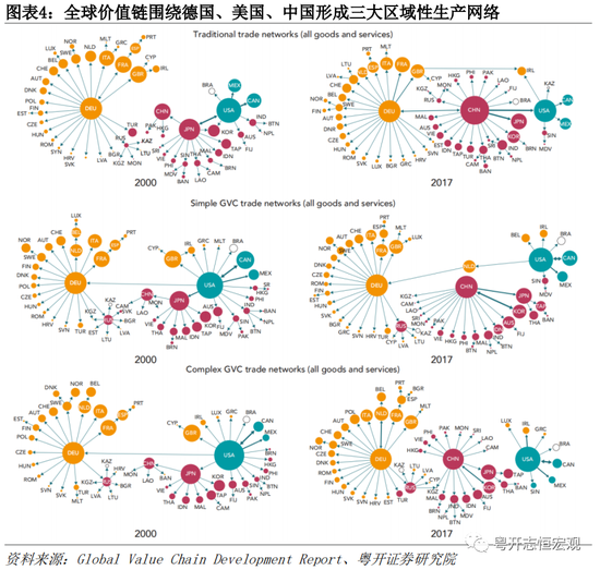 自中国加入WTO以来,全球价值链围绕中国、美国与德国形成亚太、北美和欧洲三大区域性生产网络。中美贸易摩擦之后,原有生产网络开始出现结构性调整,中美各自加强区域内部整合,并强化同欧洲的贸易联系。
