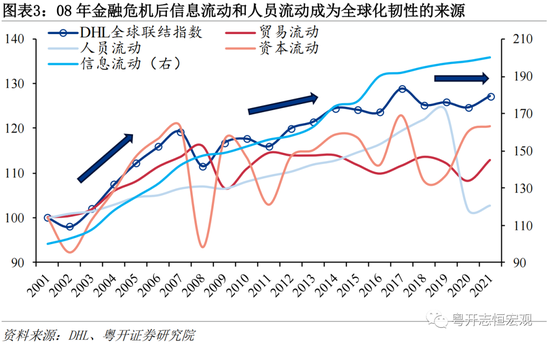 其一,2008年金融危机之后,信息流动和人员流动成为全球化韧性的来源。DHL全球联结指数在2008年后显著放缓,贸易和资本流动是主要拖累项。但与此同时,信息流动和人员流动依然保持较快增速,这或许意味着全球化正进入一个新阶段,从有形到无形、从商品到数据。但是,技术进步本身是中性的,且核心技术往往掌握在几个主要国家手中,信息技术的普及与数字化的发展既能够为全球价值链的深化提供有利条件,也可能扩大技术领先者与追随者之间的差距,使其成为加速全球经济割裂的因素。数字经济与无形资产的发展对全球化的影响仍需仔细研判。