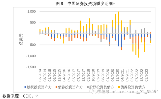 从证券投资明细来看,在2022年与2023年前三季度,中国出现了外国债券投资的大规模撤回,其中2022年净撤回1423亿美元,2023年前三季度净撤回536亿美元(图6)。虽然在2022年与2023年前三季度,外国股权投资总体上均保持了流入态势,但在2023年第三季度,外国股权投资也出现了109亿美元的净撤回。