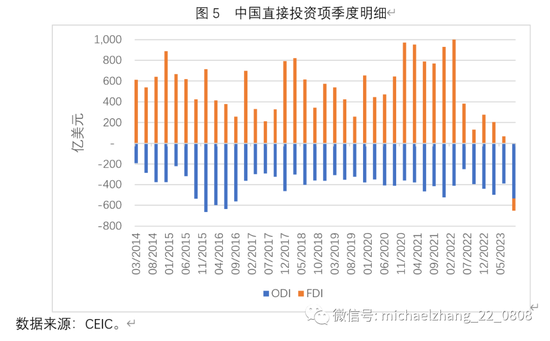 从直接投资项的资产方与负债方来看,从2022年第二季度起,流入中国的FDI规模持续显著下降(图5)。尤其是在2023年第三季度,FDI出现118亿美元净流出,这是历史上第一次FDI出现净流出。