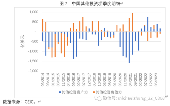 与2014-2016年、2020-2021年其他投资项的大规模净流出相比,2022年与2023年前三季度,中国均出现了其他投资项的小规模净流入(图4)。究其原因,是最近两年其他投资项均出现了外资净外撤与内资净回撤的局面(图7)。