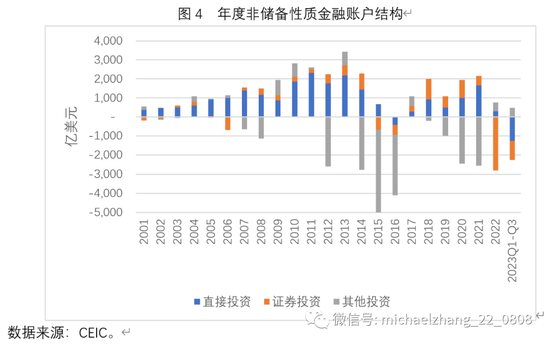 从图1中可以看出,尽管2022年与2023年前三季度,中国出现了一定规模的资本外流,但近两年资本外流的绝对规模,要远低于2015年与2016年。2015年与2016年的非储备性质金融账户逆差加上误差与遗漏项净流出均超过6000亿美元,2022年仅为3000亿美元,2023年前三季度仅为2000亿美元。因此,从总量来看,最近两年的资本外流规模并非特别严重。