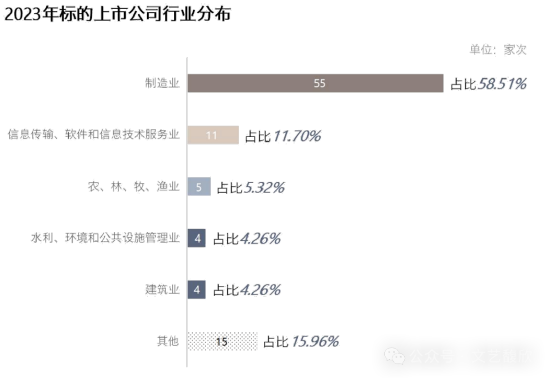 就标的上市公司的行业分布而言,根据证监会行业门类行业分类标准,排名前五的行业分别为制造业55家次(占比58.51%)、信息传输、软件和信息技术服务业11家次(占比11.70%)、农、林、牧、渔业(占比5.32%)、水利、环境和公共设施管理业4家次(占比4.26%)、建筑业4家次(占比4.26%),合计数量79家次(占比84.04%)。相较2022年度分布情况无明显变化。