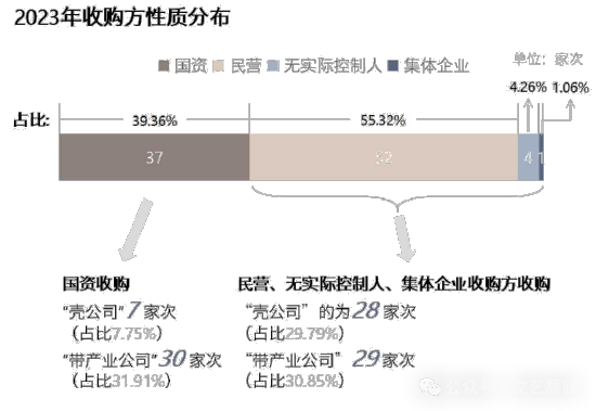 (2)带产业公司的收购方中国资占比在2023年提升至50.00%。(2021-2023年国资收购方占比分别为45.74%、42.31%、50.00%);
