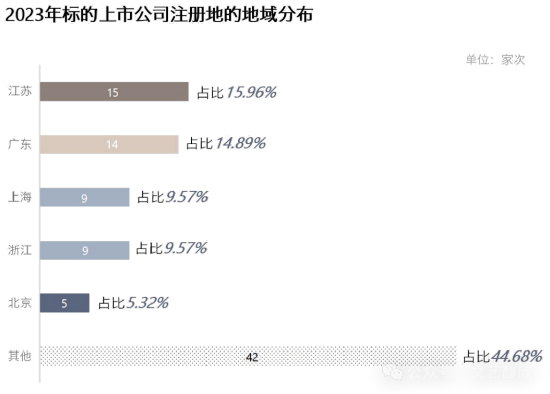 就标的上市公司的注册地而言,排名前五的省份分别为江苏15家次(占比15.96%)、广东14家次(占比14.89%)、上海9家次(占比9.57%)、浙江9家次(占比9.57%)、北京5家次(占比5.32%),合计发生数量52家次(占比55.32%)。相较于2022年度江苏省、上海占比上升,前五大省份占比与去年持平,控制权变动较为活跃的省份仍集中于长三角、珠三角、北上广深等经济活跃地区。