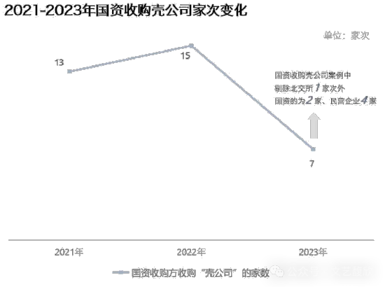 其中,国资收购壳公司案例中,剔除北交所1家次外,其余6家标的公司为国资的为2家、民营企业4家。最近三年,国资收购方收购“壳公司”的家数分别为13家次、15家次、7家次,呈持续下降趋势,国资收购方买壳策略基本淡出市场,收购带产业公司的趋势未变。