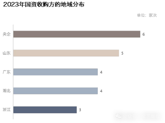 就国资收购方的地域分布而言,收购方排名前五的分别为央企6家、山东5家、广东4家、湖北4家、浙江3家。相较于2022年,山东、广东仍然为收购上市公司活跃省份。