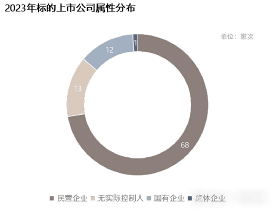 就标的上市公司属性而言,民营企业为68家次(占比72.34%),无实际控制人为13家次(占比13.83%)、国有企业为12家次(占比12.77%),集体企业为1家次(占比1.06%)。相较2022年度民营企业占比无明显变化。