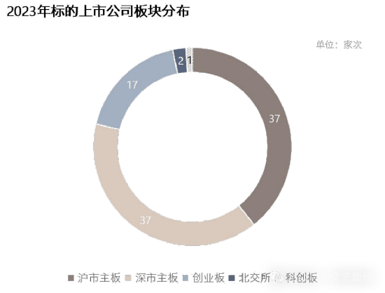 就标的上市公司板块而言,沪市主板37家次(占比39.36%)、深市主板37家次(占比39.36%)、创业板17家次(占比18.09%)、北交所2家次(占比2.13%)、科创板1家次(1.06%)。相较于2022年度总体分布无明显变化,其中,科创板案例为孚能科技(688567.SH)以协议转让方式转让控制权,但已于2023年11月终止。北交所为同辉信息(430090.BJ)以定增方式取得控制权、微创光电(430198.BJ)以原股东解除一致行动协议、新实控方增持不超过1%及签署一致行动协议方式取得控制权。随着北交所上市公司的不断增多,北交所层面的控制权交易可能陆续出现。