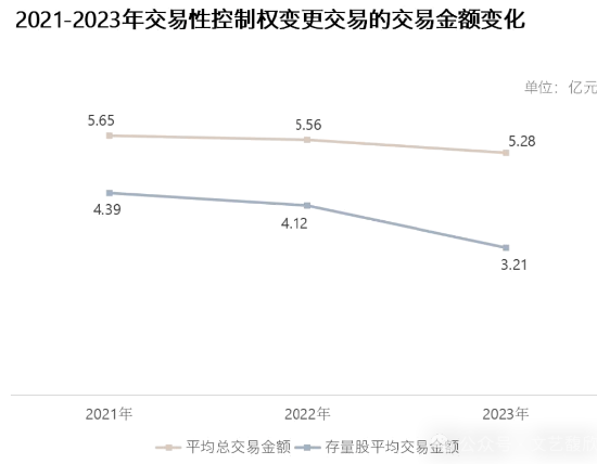 (3)壳公司买方收购预算在持续下降。(2021-2023壳公司平均股份交易比例分别为20.98%、20.71%、23.11%,平均总交易金额分别为5.65亿元、5.56亿元、5.28亿元,存量股平均交易金额分别为4.39亿元、4.12亿元、3.21亿元)。
