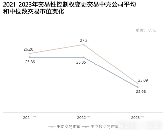 (2)壳公司交易估值仍持续下滑。(2021-2023年壳公司平均交易估值分别为26.26亿元、27.20亿元、23.09亿元;中位数交易估值分别为25.86亿元、25.85亿元、22.68亿元);