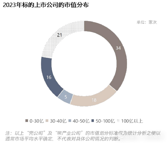 就标的上市公司的市值分布而言,按控制权转让相关协议签署日前一交易日(如未签署协议的以交易公告日前一交易日为准)(以下简称“基准日”)收盘市值统计,标的公司市值低于30亿元(本文作为“壳公司”划分标准)的为34家次(占比36.17%),标的公司市值高于30亿元(本文作为“带产业公司”划分标准)的为60家次(占比63.83%),相较2022年度壳公司41%的占比略有下降。