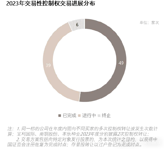 截至2023年12月31日,交易性控制权交易中已完成的共49家次(占比52.13%),正在进行中的共40家次(占比41.49%),已终止的共6家次(占比6.38%)。