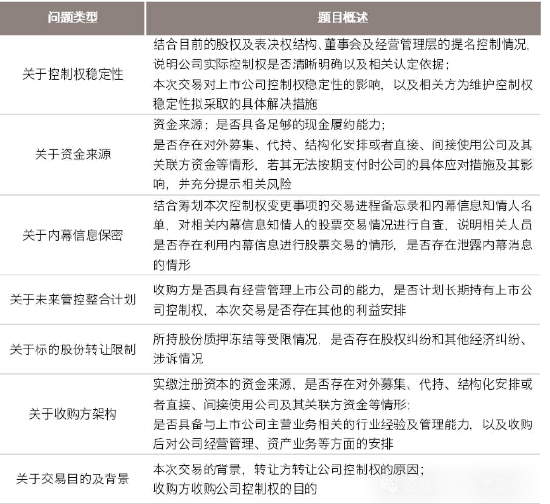 2023年度共18家次控制权变更案例(剔除定增审核常规问询)收到交易所下发的关注函或问询函,问询次数均为1次,平均题目数量4题,平均回复用时8天。按题目出现频率从高到低,监管主要关注问题如下: