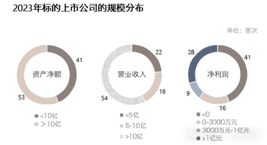 以2022年度(末)资产净额、营业收入、净利润指标,标的上市公司的上述财务指标分布上,资产净额在10亿元以下的为41家(占比43.62%)、10亿元以上的为53家(占比56.38%),营业收入在5亿元以下的为22家(占比23.40%)、5亿元至10亿元的为18家(占比19.15%)、10亿元以上为54家(占比57.45%),净利润为负的企业为41家(占比43.62%)、0-3,000万元的为16家(占比17.02%)、3,000万元-1亿元的为9家(占比9.57%)、1亿元以上的为28家(占比29.79%)。