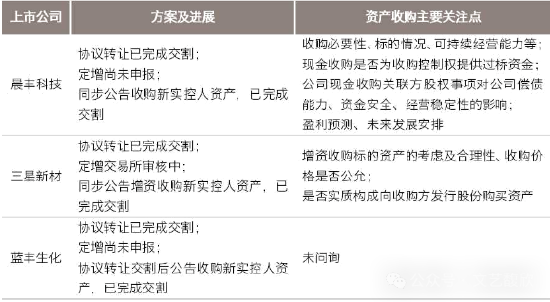 2023年共有3单壳交易同步或者在控制权变更公告6个月内公告注入资产事项,分别为三星新材(603578.SH)、晨丰科技(603685.SH)、蓝丰生化(002513.SZ),方案及进展如下: