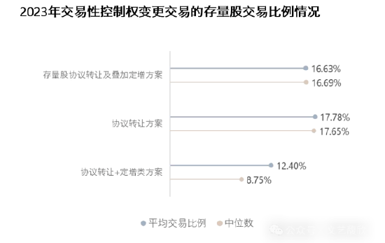 就存量股协议转让及叠加定增方案而言,存量股部分的平均交易比例为16.63%,中位数为16.69%。其中,协议转让方案存量股平均交易比例为17.78%,中位数为17.65%;协议转让+定增类方案存量股平均交易比例为12.40%,中位数为8.75%。
