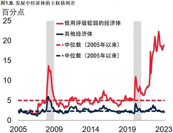 A.利差大于10个百分点的发展中经济体所占比例,按月平均值计算。在2023年平均利差超过10个百分点的发展中经济体中,有一个国家的评级为B3/B-,其余国家的评级为Caa1/CCC+或以下。