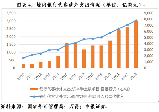 据外汇局统计,2023年,银行代客“直接投资”支出增长15%,增速较上年提高5.5个百分点,但是2022和2023年两年复合平均增长12%,较2020和2021年均速低了16.7个百分点。而且,银行代客“直接投资”支出还包含了对外直接投资的资本金汇出。同期,商务部口径的对外直接投资增长11%,国际收支口径的对外直接投资净流出增长24%,其中对外股权投资净流出增长35%。2023年,银行代客“初次收入和二次收入”支出增长10%,增速较上年提高1.1个百分点,但是2022和2023年两年复合平均增长10%,较2020和2021年均速低了3.2个百分点(见图表4)。由此可见,即便近两年有外方撤资和利润汇出,却并未出现异常增长。