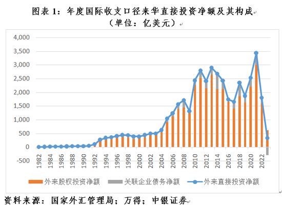 国际收支口径的外来直接投资有股权投资(包括新增股本投资和利润再投资)和关联企业债务(即外商投资企业外方股东贷款)两个组成部分。2023年,来华直接投资项下的外来股权投资净流入621亿美元,继上年萎缩47%后再降61%,年度净流入规模降至2005年以来新低;关联企业债务由上年净流入205亿转为净流出291亿美元,为1982年有数据以来首次年度净流出(见图表1)。正是因为这两个主要项目均出现了二三十年一遇的巨大变化,才导致全年来华直接投资净流入规模创近三十年新低。