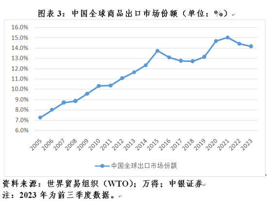 2022年以来,随着世界其他国家和地区生产经营活动逐渐正常化,中国出口市场份额已开始见顶回落,但至今仍高于疫情前水平。据世界贸易组织统计,2022年,中国份额为14.4%,较2021年下滑0.6个百分点,较2020年低了0.3个百分点;2023年前三季度,中国份额为14.2%,与上年同期基本持平,较上年全年低了0.2个百分点,却仍较2019年高出1.0个百分点(见图表3)。这一时期,中国利用外商直接投资发生类似变化并不出人意料。2022年,联合国贸发会口径来华直接投资同比增速骤降至5%,可比的商务部口径来华直接投资2023年更是转为下降13%。同期,国际收支口径来华直接投资净流入也均出现了两位数的降幅(见图表1和图表2)。