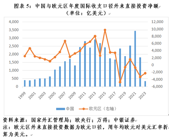 从国际收支口径看,2023年,韩国和印度外来直接投资也经历了较为剧烈的下跌。全年,韩国外来直接投资净流入同比下降了39%;前三季度,印度外来直接投资净流入同比下降了21%。此外,据欧央行统计,2021和2022年,欧元区国际收支口径外来直接投资分别净流出675亿和3299亿美元,2023年净流出虽然较上年下降31.9%,却仍高达2248亿美元。拉长时间看,过去六年来,除2020年录得1595亿美元净流入外,欧元区其他五个年份均为净流出,五年净流出规模平均为2309亿美元(见图表5)。如果中国只是净流入减少就要着急上火,那么欧元区连年巨额外流就更要夜不能寐了。